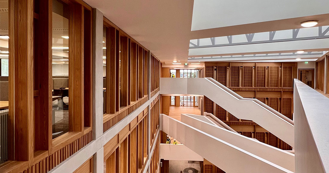 - Central atrium linking the three blocks with a series of cantilevered walkways and bridges gaining access to the breakout zones, toilets, tea stations/kitchen, meeting rooms and conference facilities